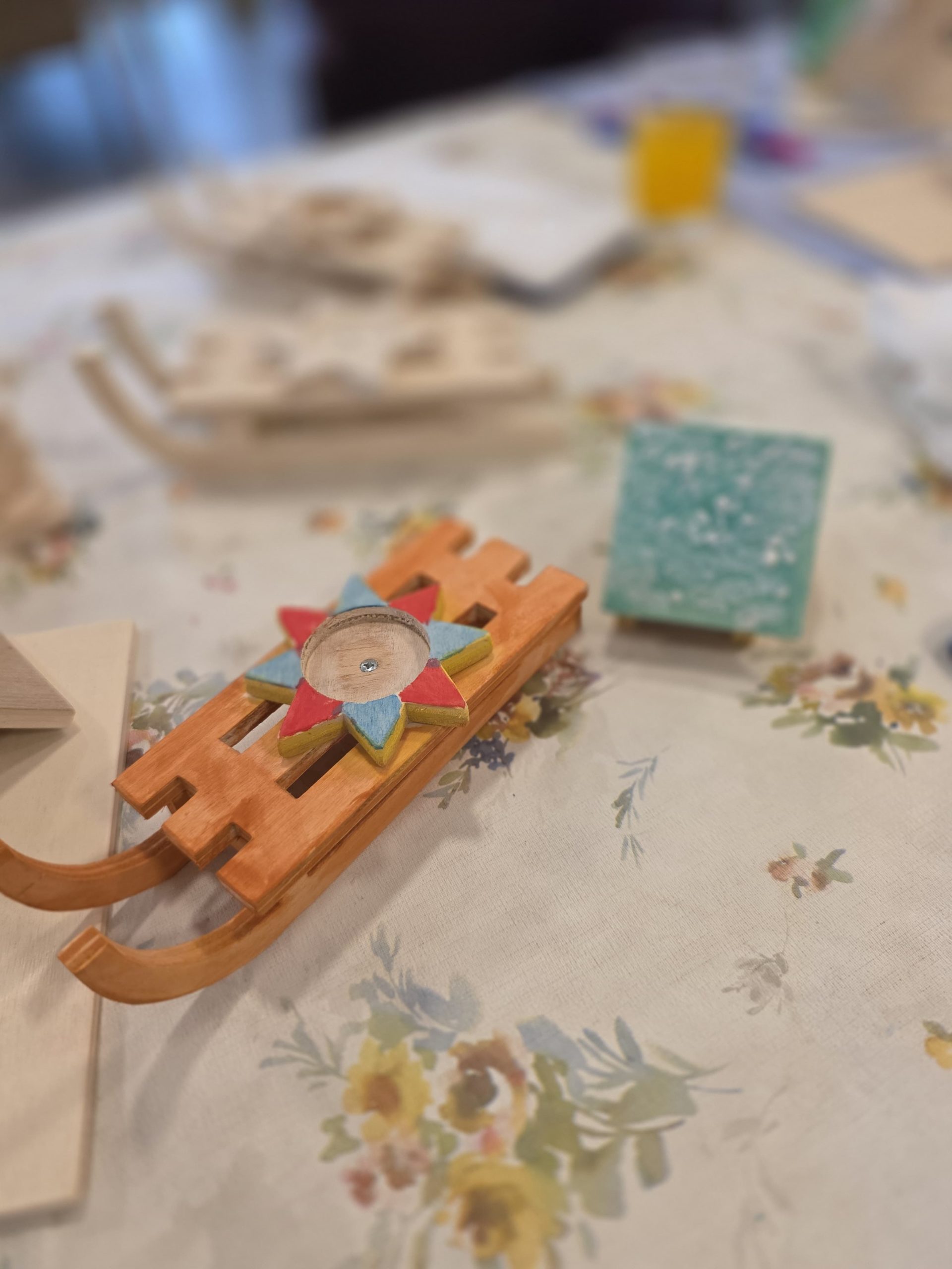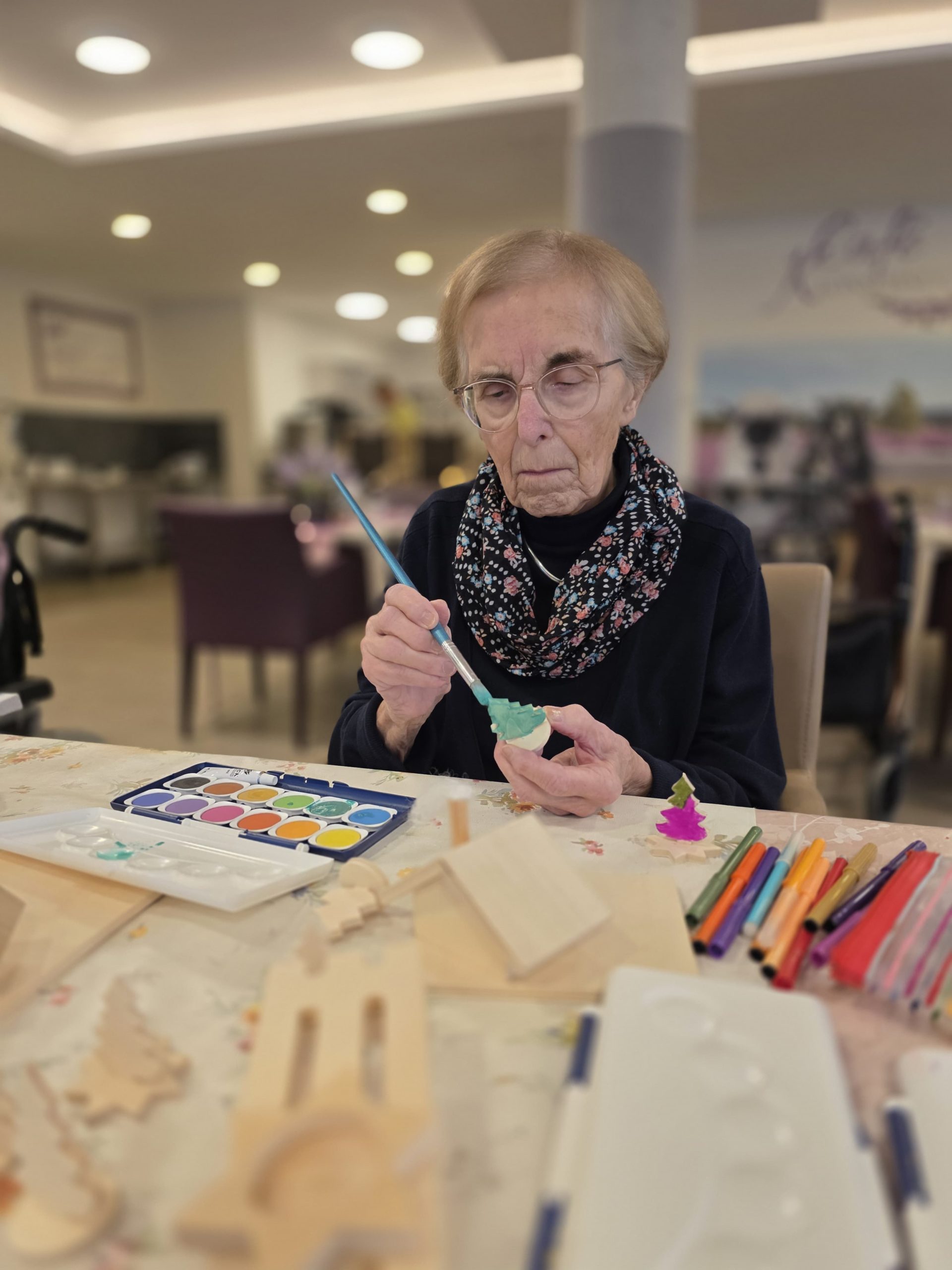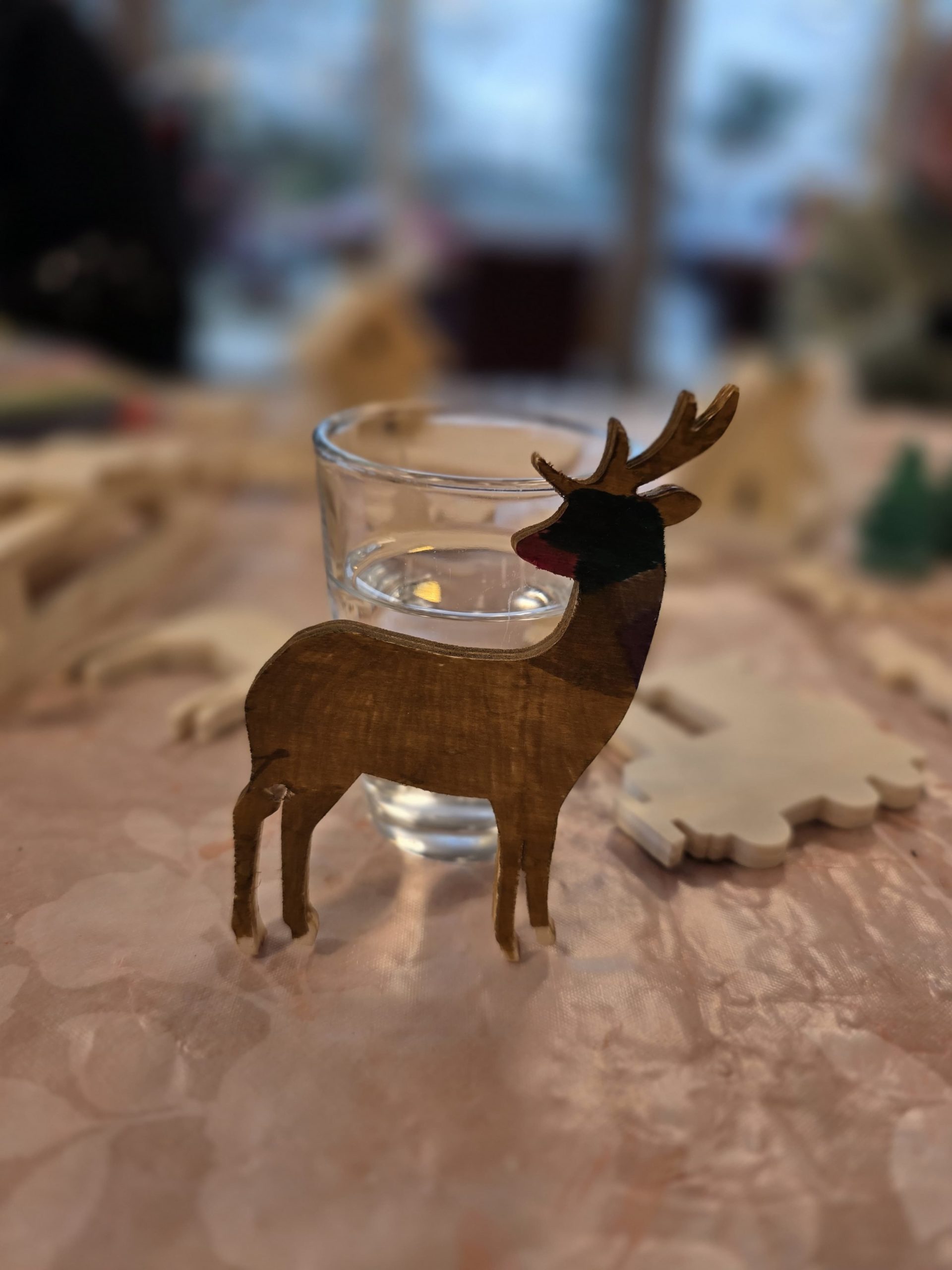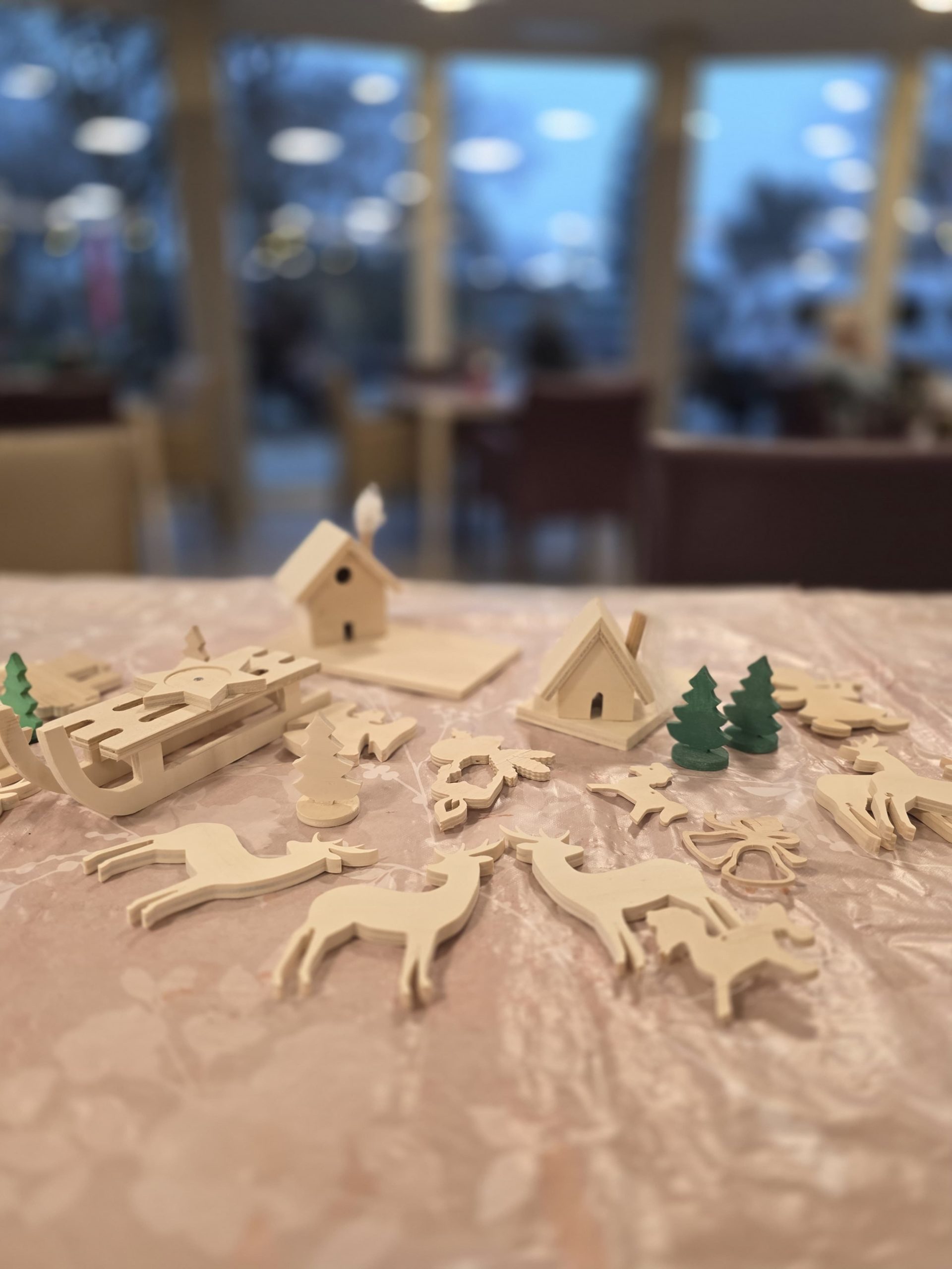 Gemeinsam mit den BewohnerInnen wurden kleine Holzdekorationen für die Weihnachtszeit bemalt – darunter Häuschen, Schlitten, Tannenbäume und viele süße Rentiere.