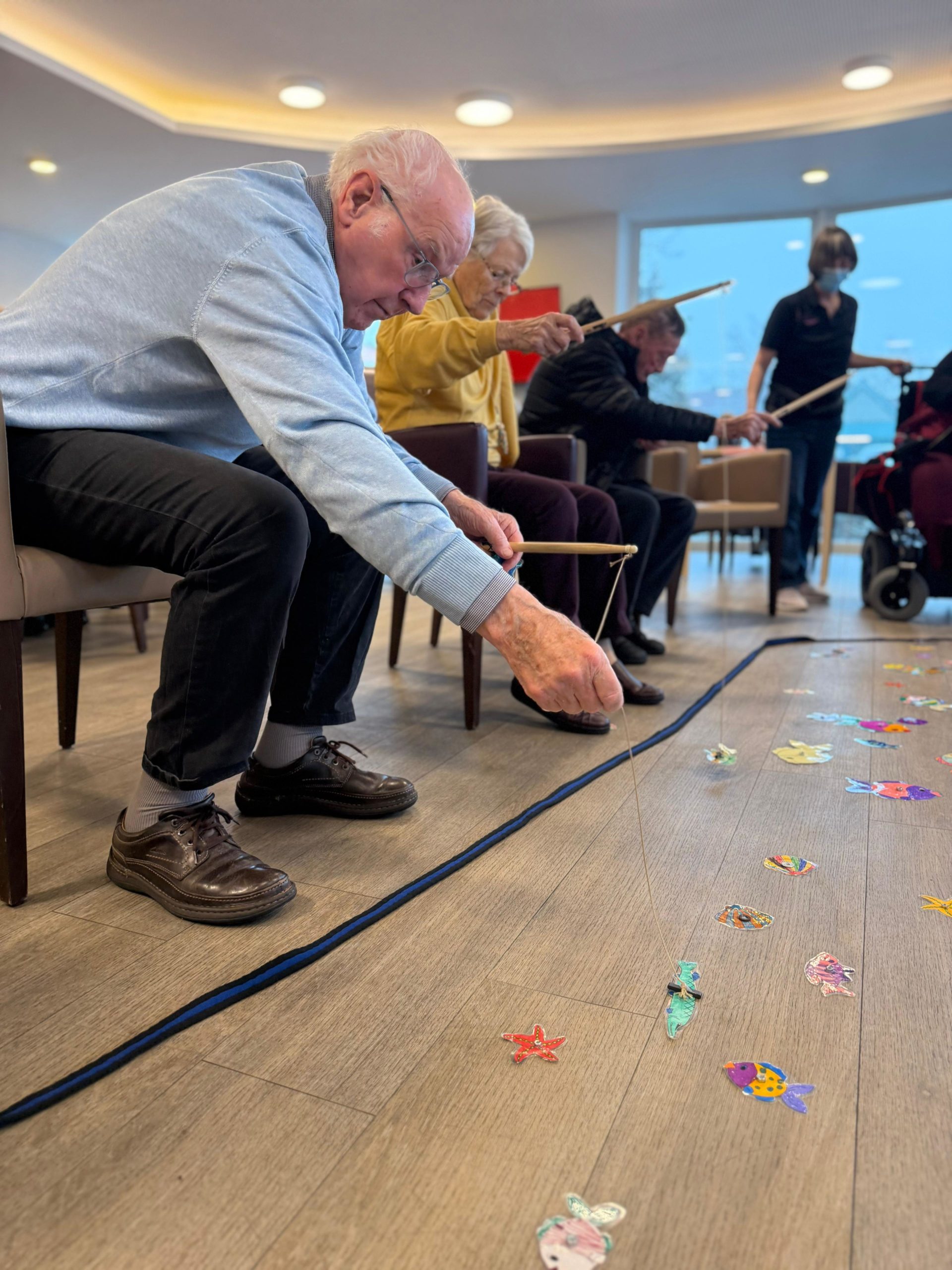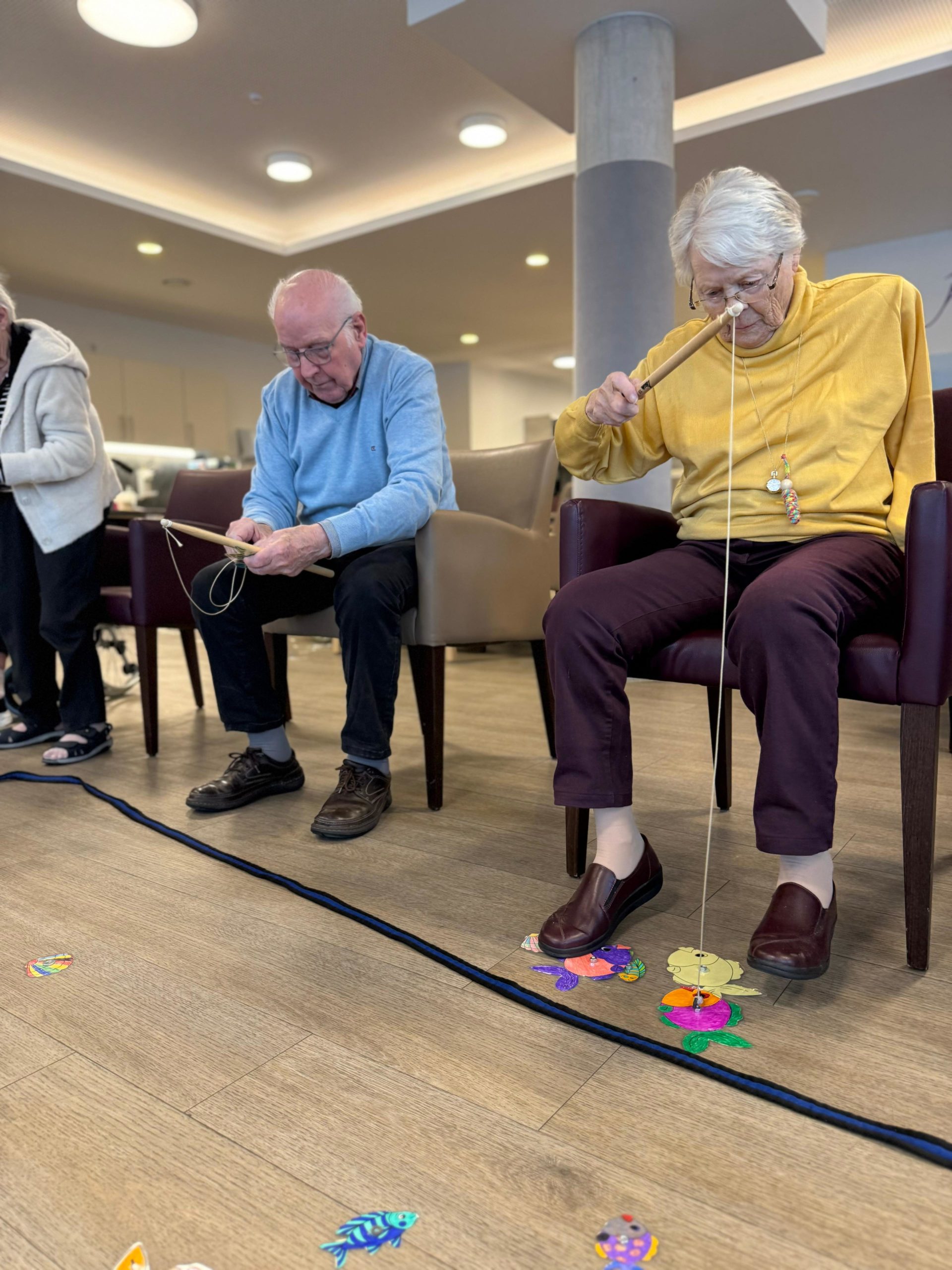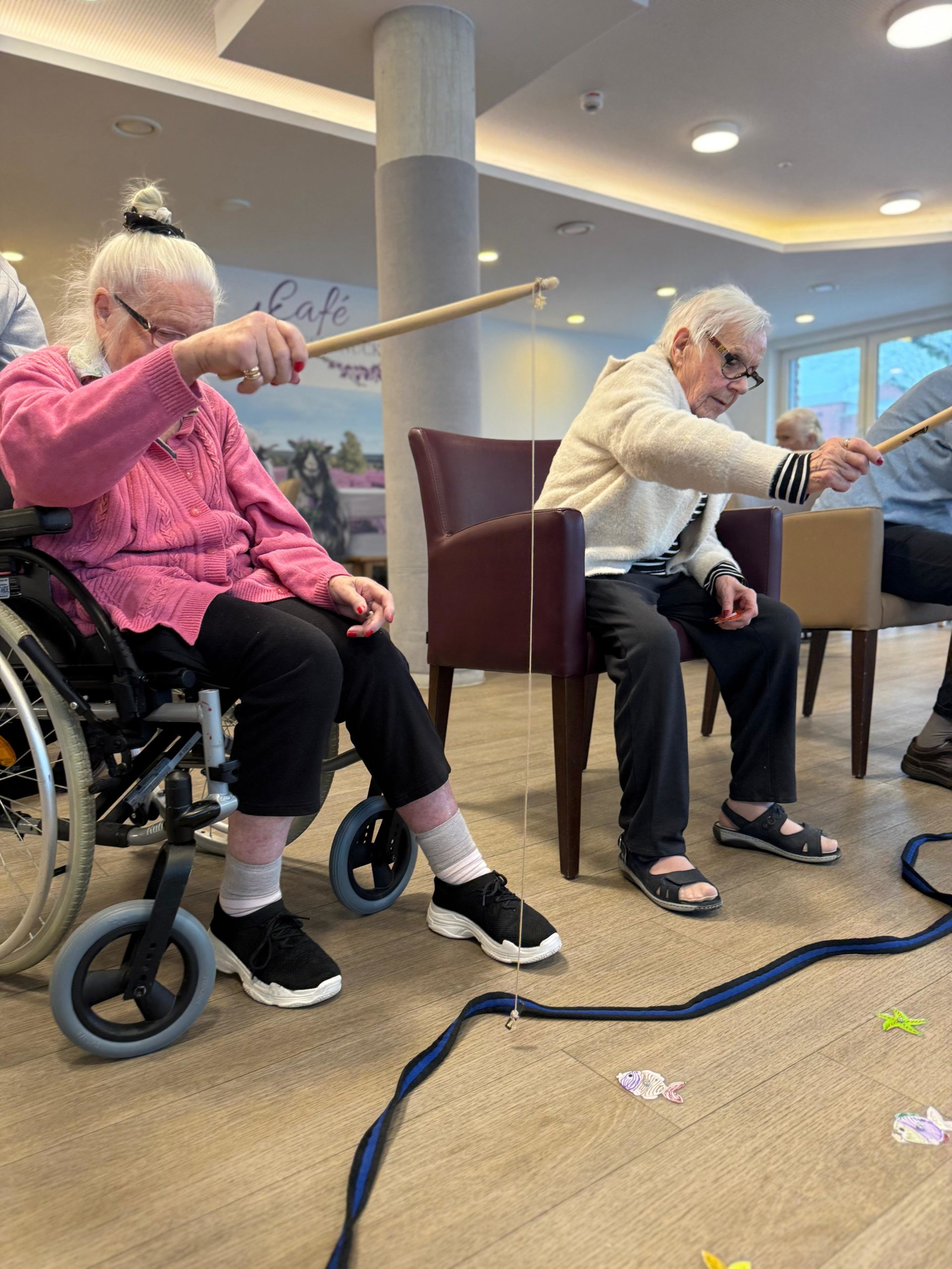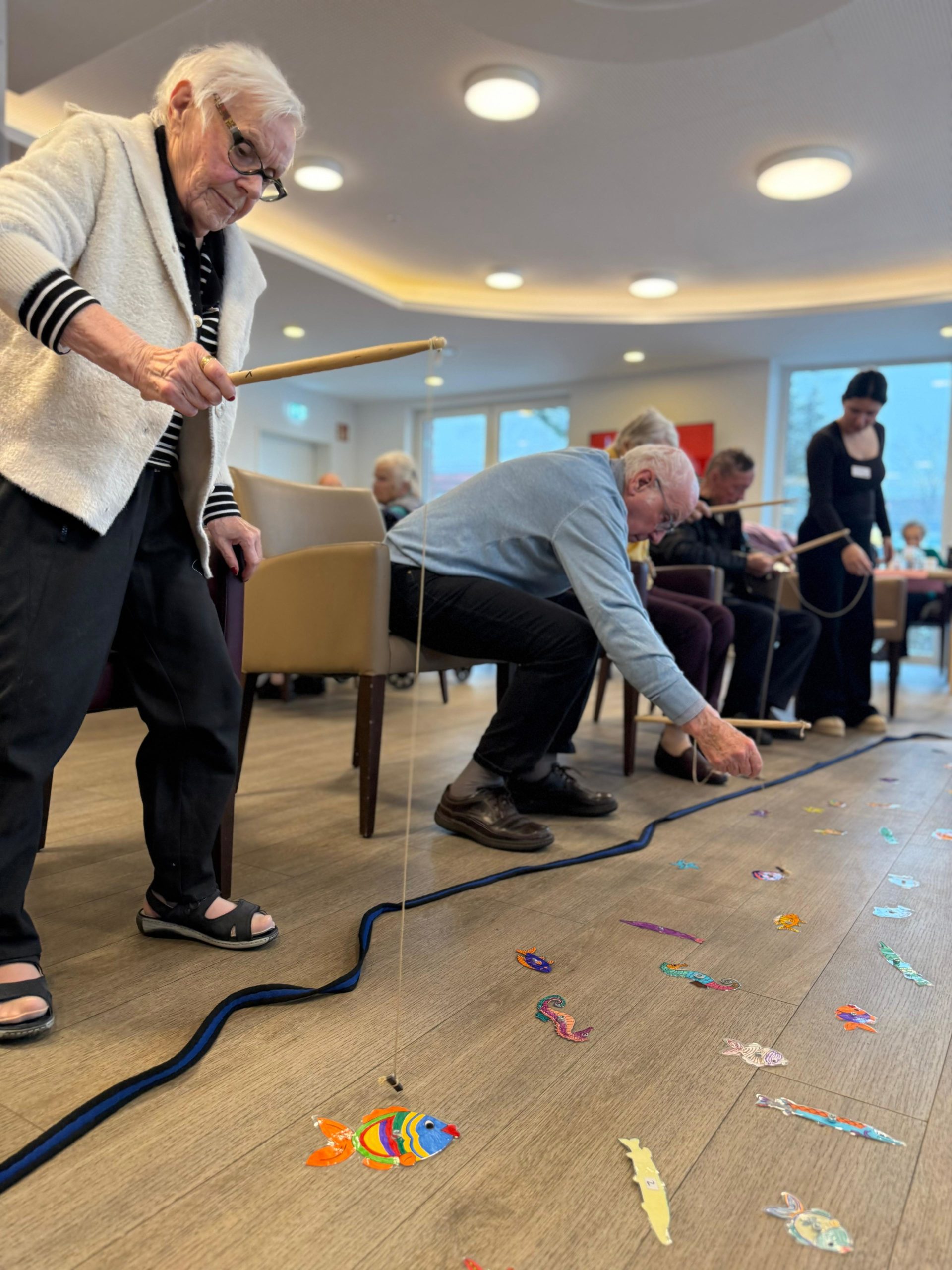 Mit viel Freude und Ehrgeiz haben unsere Bewohner und Bewohnerinnen ihr selbstgebasteltes Spiel „Fische angeln“ ausprobiert.